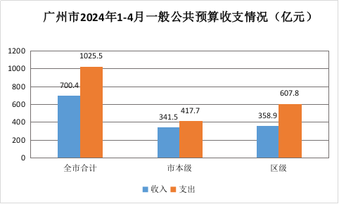 1-4月,全市一般公共預算收入700.4億元,增長1.9%。其中:市本級收入341.5億元,下降0.7%;區(qū)級收入358.9億元,增長4.4%。