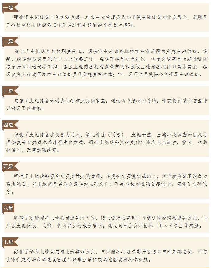 《辦法》從總則、規劃和計劃、資金管理、項目實施、前期開發、儲備土地管理、附則等七章、三十六條內容規范土地儲備行為。