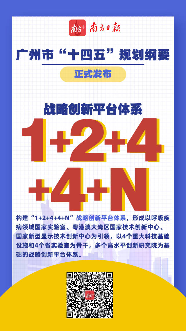 一方面,廣州要構建“1+2+4+4+N”戰略創新平臺體系,形成以呼吸疾病領域國家實驗室、粵港澳大灣區國家技術創新中心、國家新型顯示技術創新中心為引領,以4個重大科技基礎設施和4個省實驗室為骨干,多個高水平創新研究院為基礎的戰略創新平臺體系。