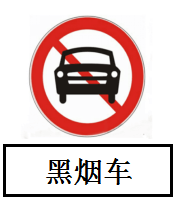 黑煙車禁行標志牌主標為國家規定的“禁止機動車通行”禁令標志,下面輔以“黑煙車”文字(式樣見下圖)。