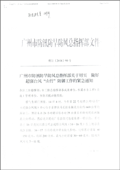轉發廣州市防汛防旱防風總指揮部關于切實做好超強臺風“山竹”防御工作的緊急通知 請各單位做好防御