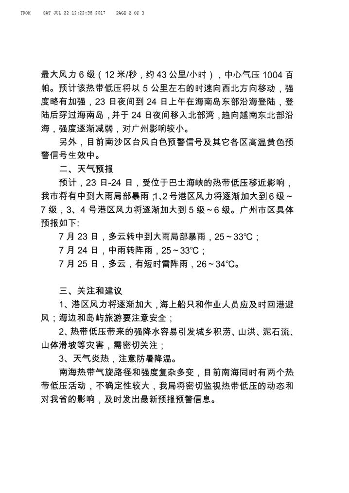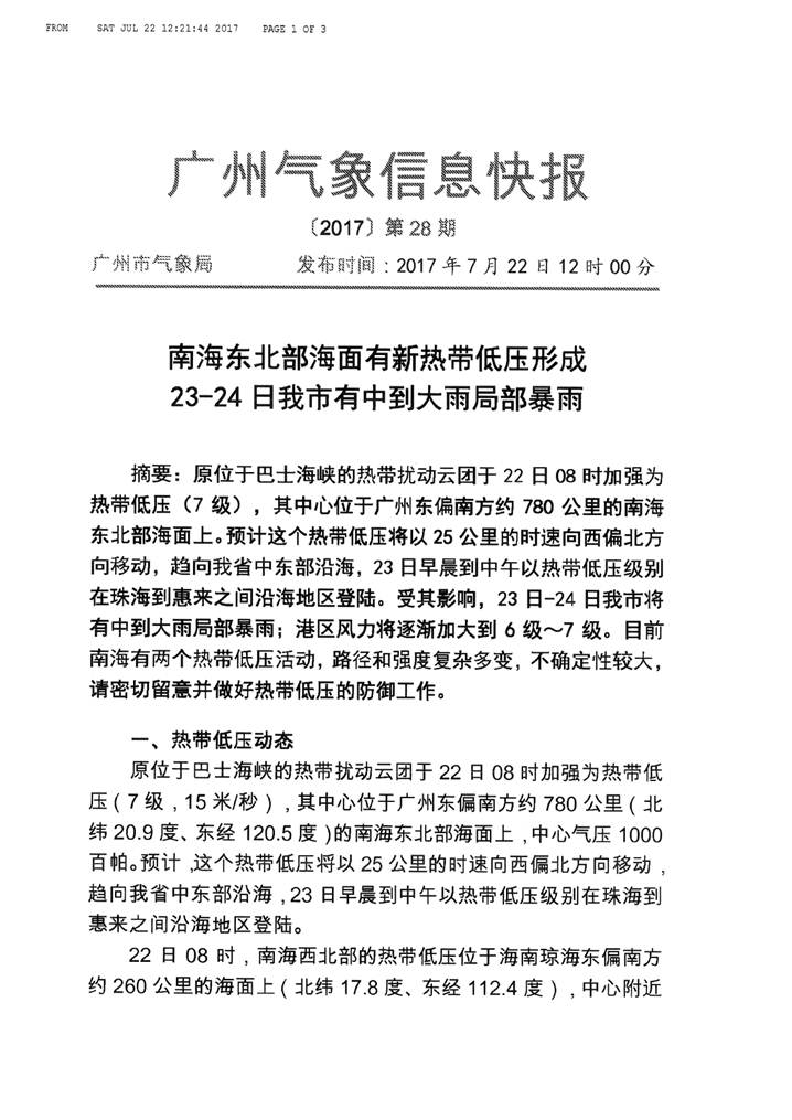 轉發南海東北部海面有新熱帶低壓形成 23-24日我市有中到大雨局部暴雨 請做好防御