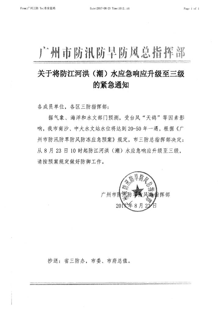 轉(zhuǎn)發(fā)關(guān)于將防江河洪(潮)水應急響應升級至三級的緊急通知