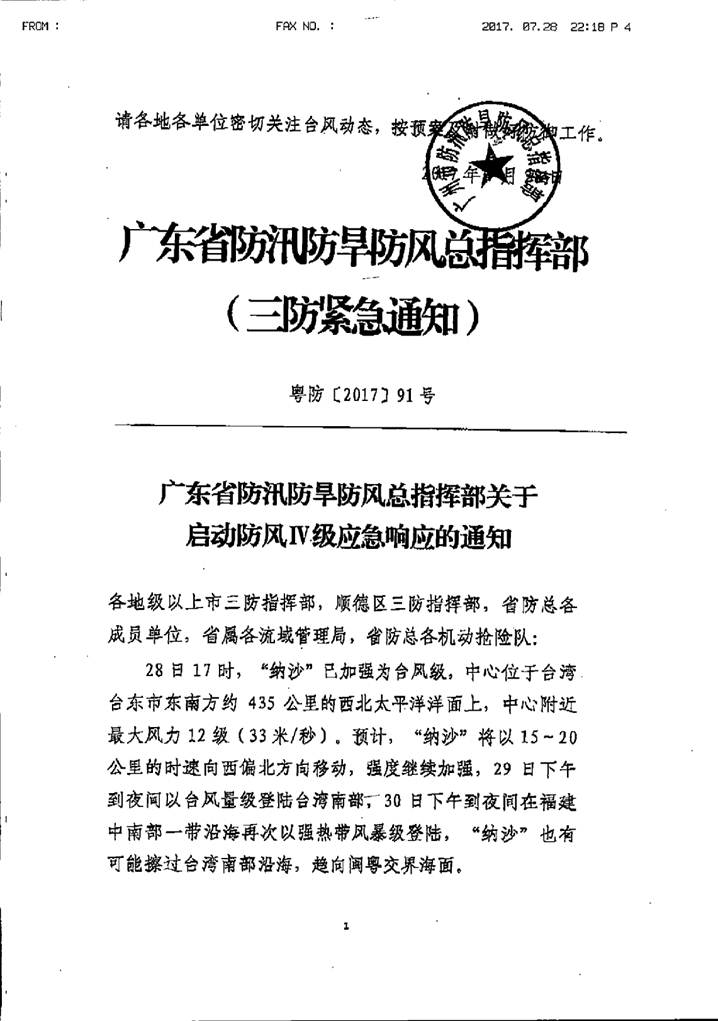 轉(zhuǎn)發(fā)廣東省防汛防旱防風(fēng)總指揮部關(guān)于啟動(dòng)防風(fēng)Ⅳ級(jí)應(yīng)急響應(yīng)的通知