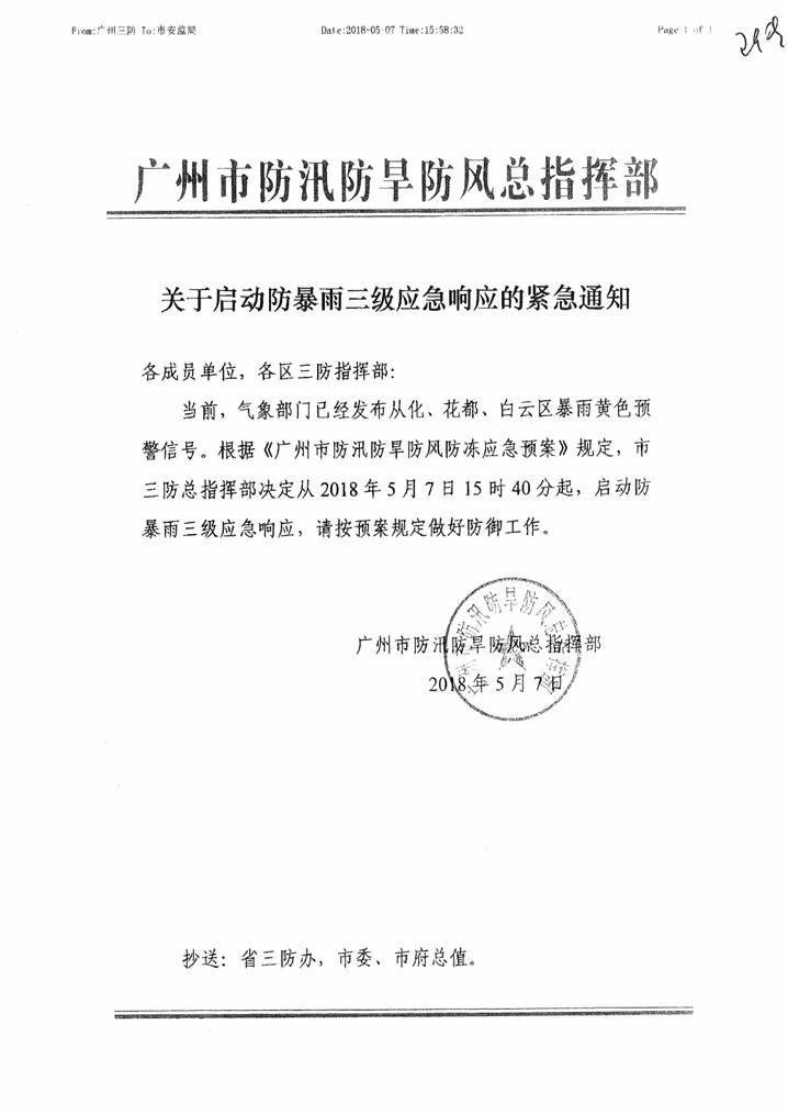 轉發廣東省防汛防旱防風總指揮部關于啟動防暴雨三級應急響應的緊急通知,請做好防御