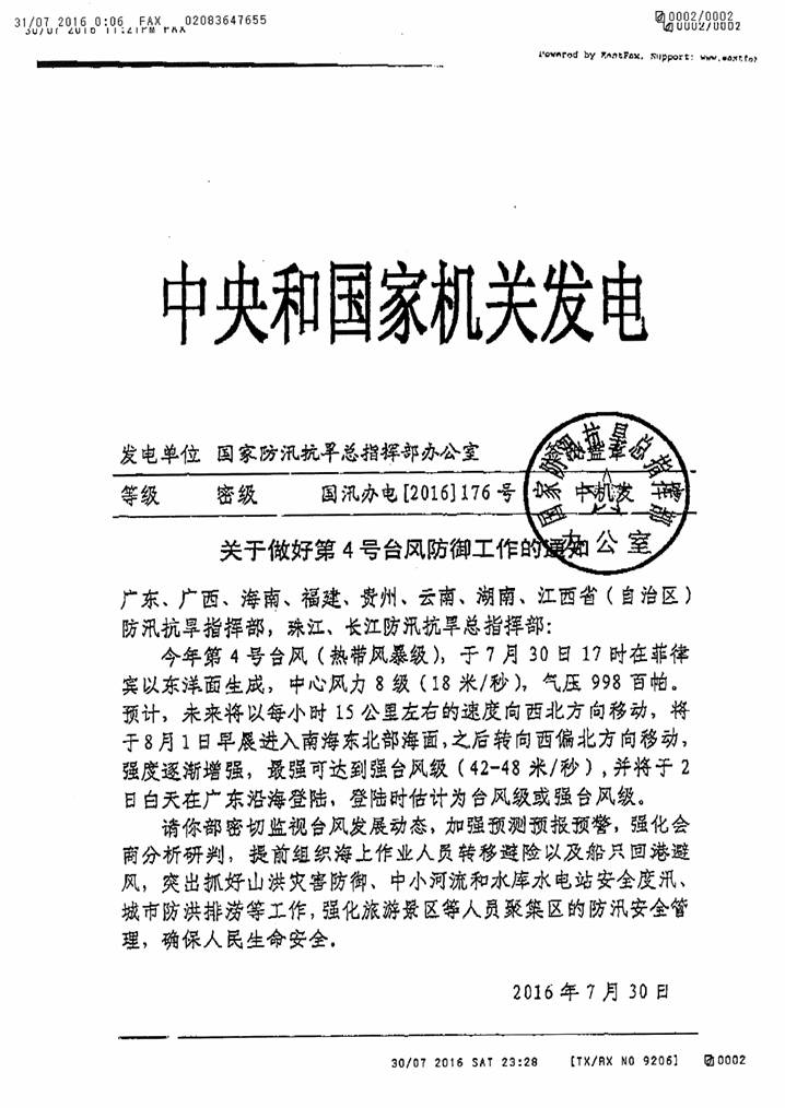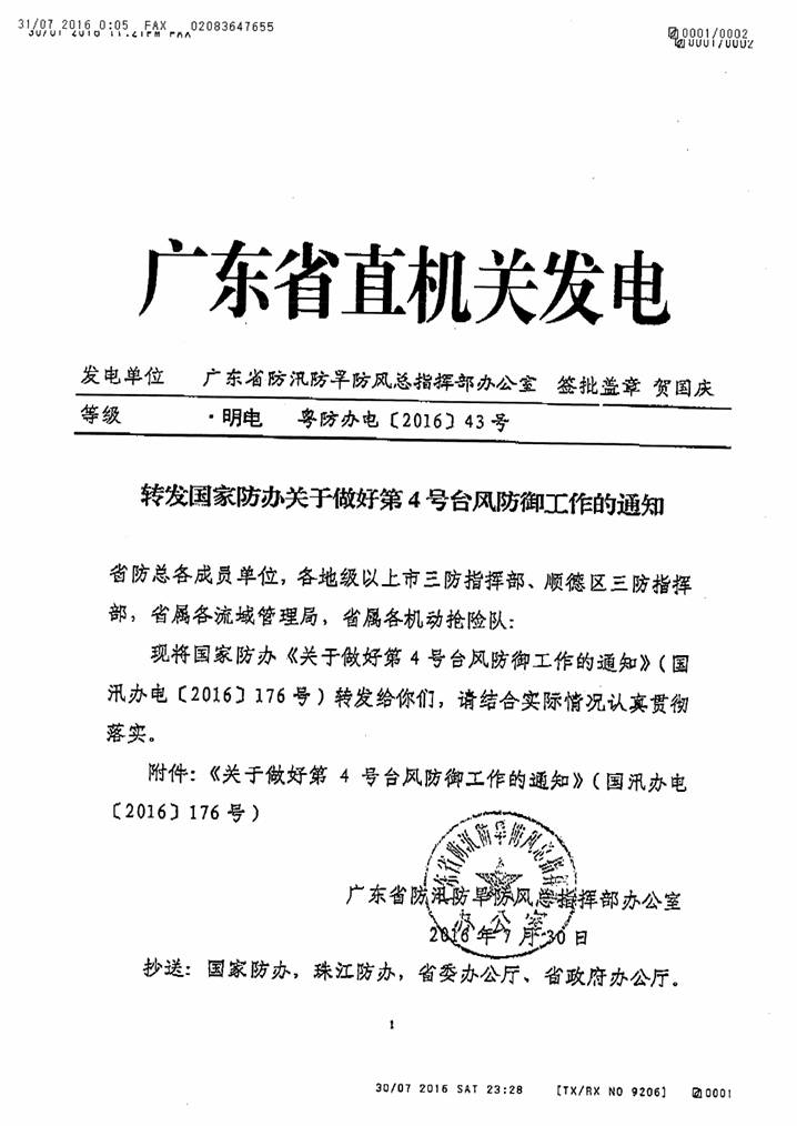 轉(zhuǎn)發(fā)國(guó)家防辦關(guān)于做好第4號(hào)臺(tái)風(fēng)防御工作的通知