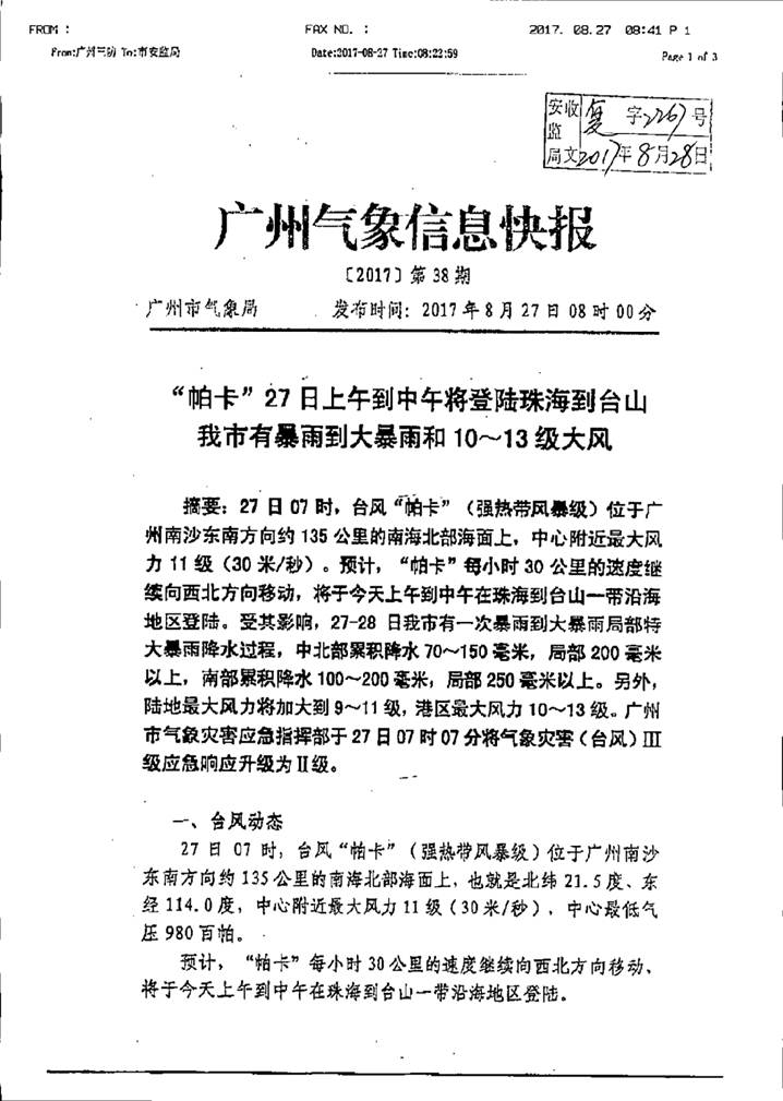 轉發“帕卡”27日上午到中午將登陸珠海到臺山,我市有暴雨到大暴雨和10-13級大風,請各單位做好防御工作