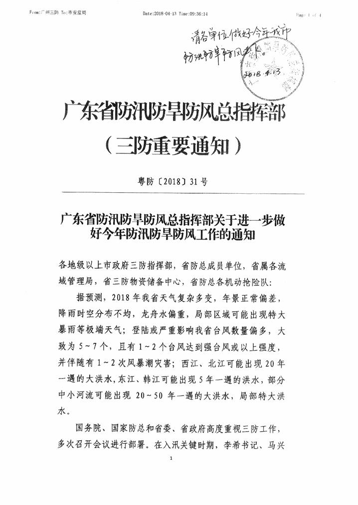 轉發廣東省防汛防旱防風總指揮部關于進一步做好今年防汛防旱防風工作的通知,請各單位做好防御工作