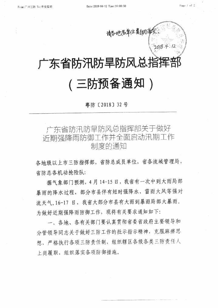 轉(zhuǎn)發(fā)廣東省防汛防旱防風(fēng)總指揮部關(guān)于做好近期強(qiáng)降雨防御工作并全面啟動(dòng)汛期工作制度的通知,請(qǐng)各有關(guān)單位進(jìn)入汛期戰(zhàn)備狀態(tài)