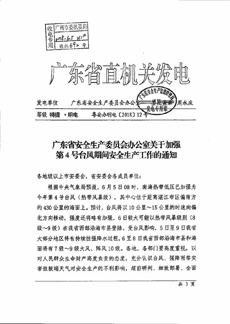 轉發廣東省安全生產委員會辦公室關于加強第4號臺風期間安全生產工作的通知