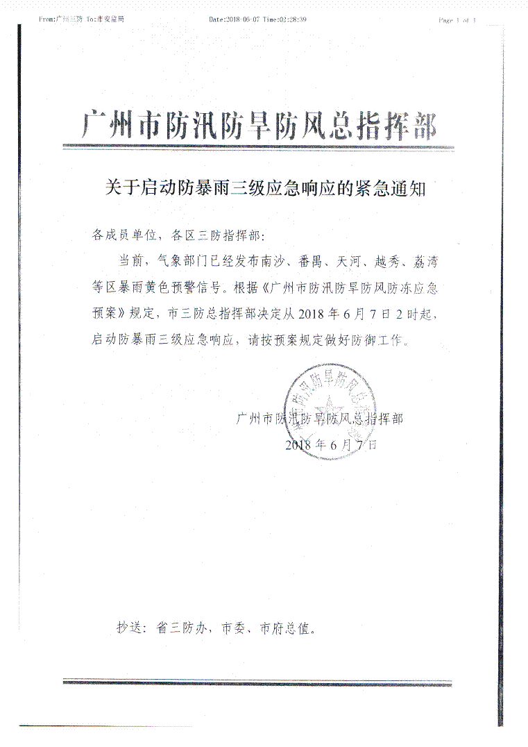 轉發廣州市防汛防旱防風總指揮部關于啟動防暴雨三級應急響應的緊急通知