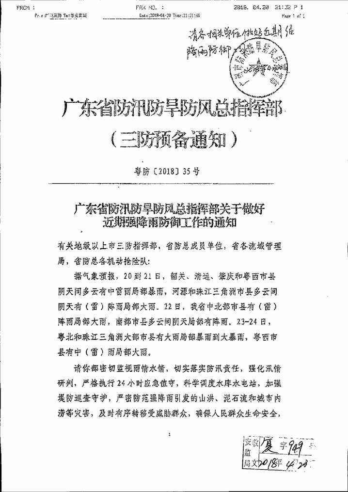轉發廣東省防汛防旱防風總指揮部關于做好近期強降雨防御工作的通知,請各單位做好防御