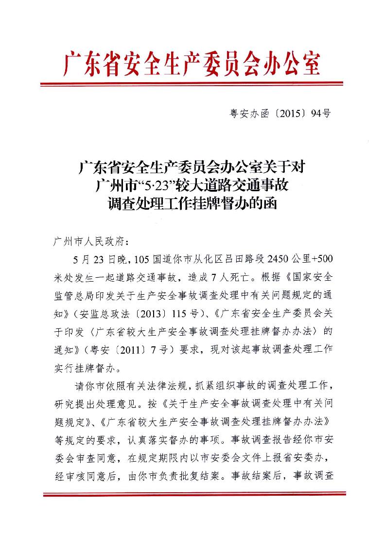 廣東省安全生產(chǎn)委員會(huì)辦公室關(guān)于對(duì)廣州市“5.23”較大道路交通事故調(diào)查處理工作掛牌督辦的函