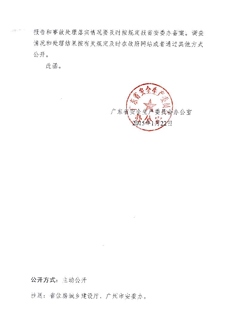 廣東省安全生產委員會辦公室關于對廣州市“12.29”較大坍塌事故調查處理工作掛牌督辦的函