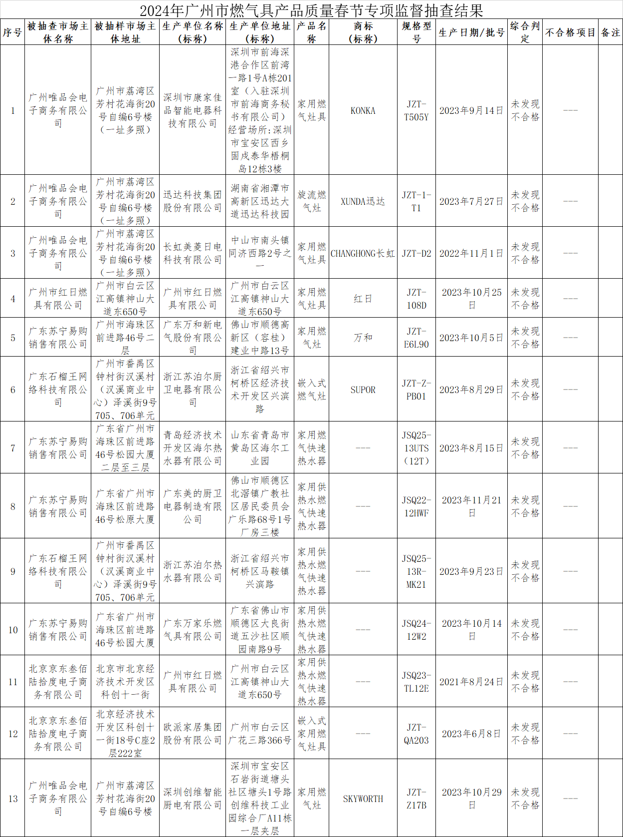 近日,廣州市市場監督管理局對燃氣用具產品進行了專項監督抽查,共抽查了13批次樣品,經檢驗,未發現不合格。