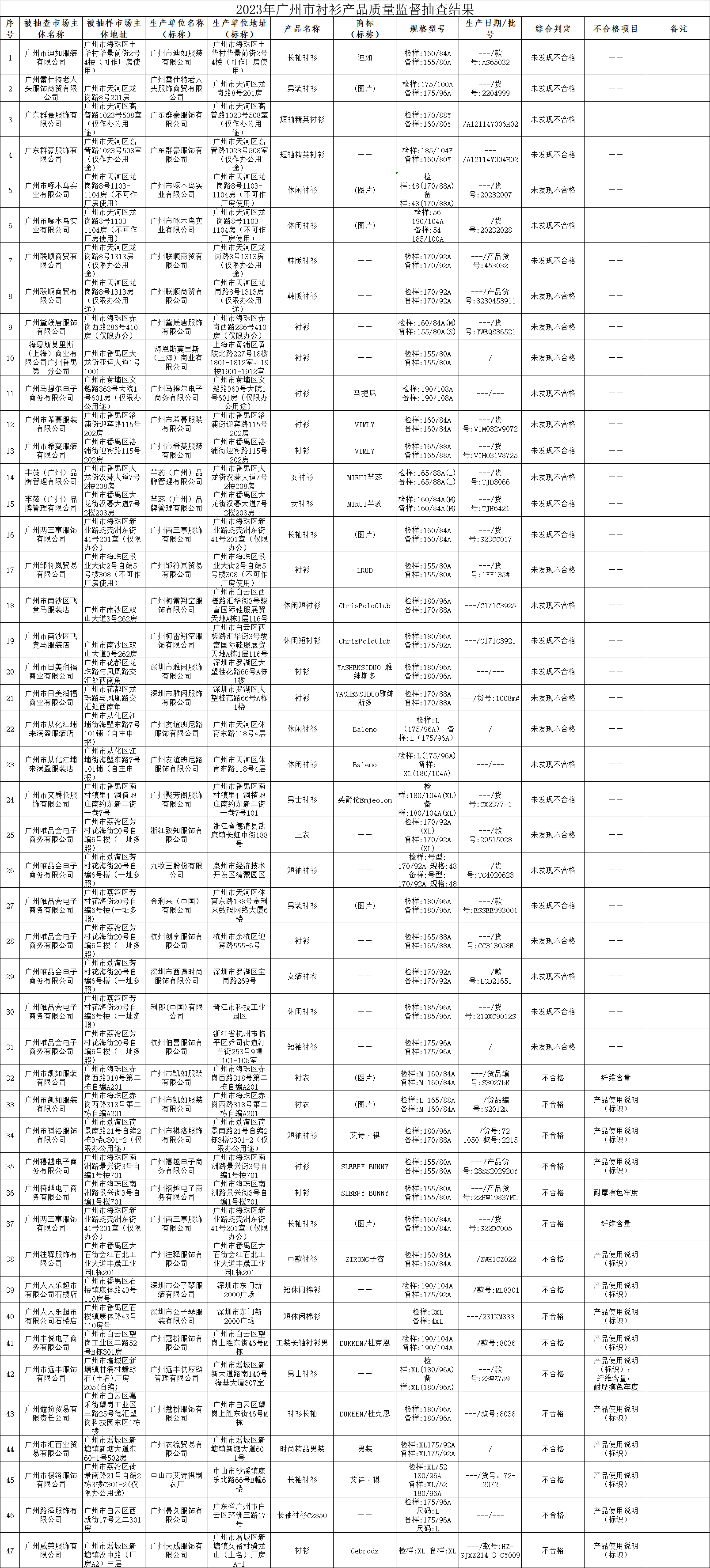 附件:2023年廣州市襯衫產(chǎn)品質(zhì)量監(jiān)督抽查結(jié)果