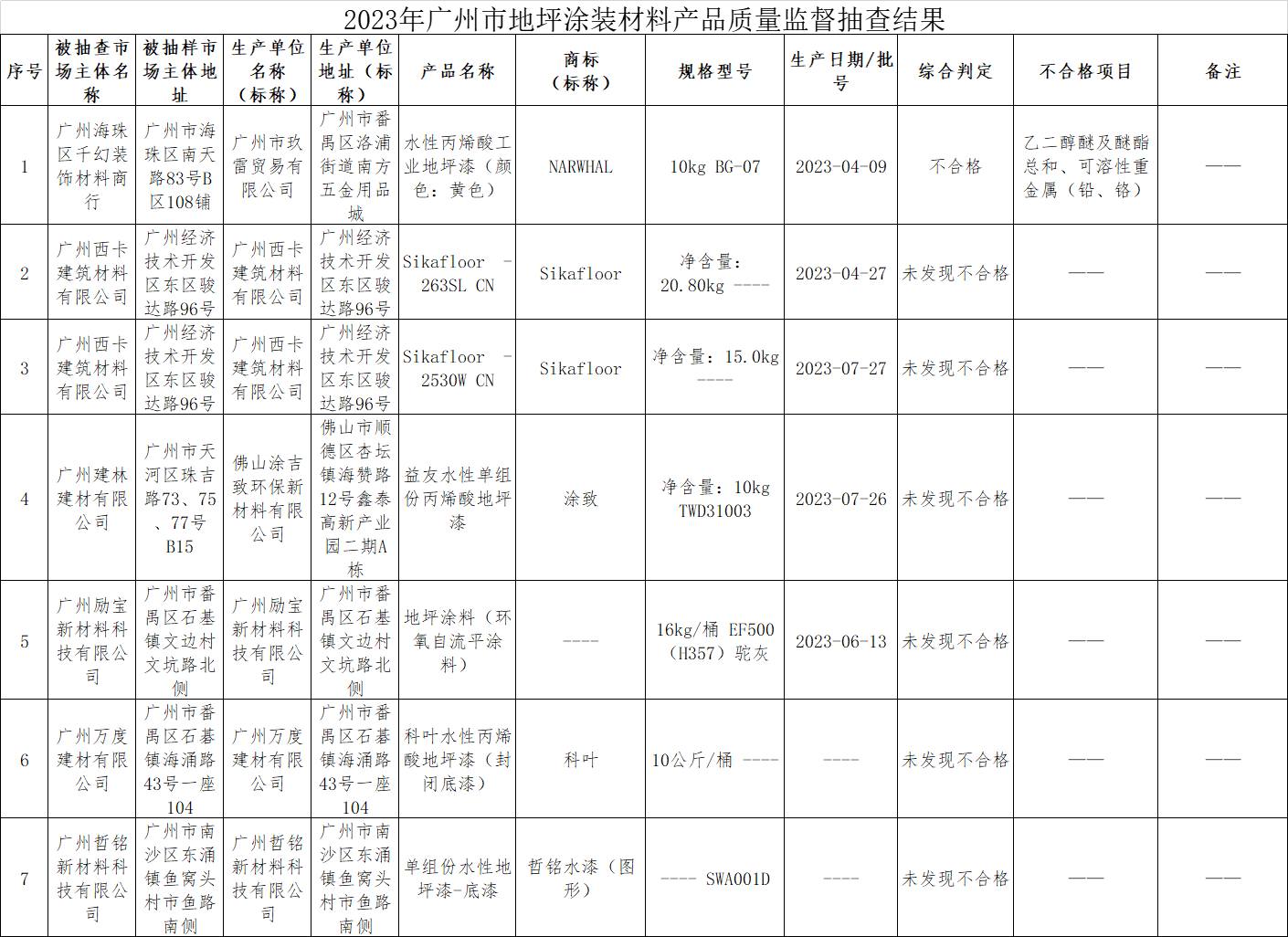 附件:2023年廣州市地坪涂裝材料產(chǎn)品質(zhì)量監(jiān)督抽查結(jié)果