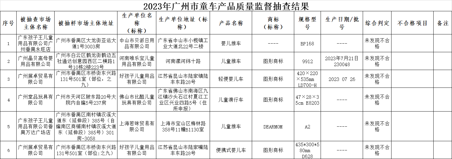 2023年第3季度,廣州市市場監督管理局對童車產品質量進行了監督抽查,共抽查了6批次產品,經檢驗,全部產品符合標準要求。