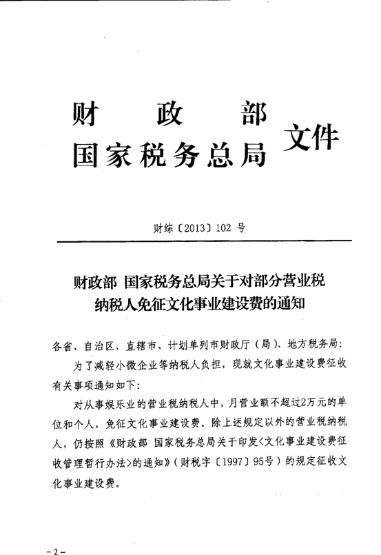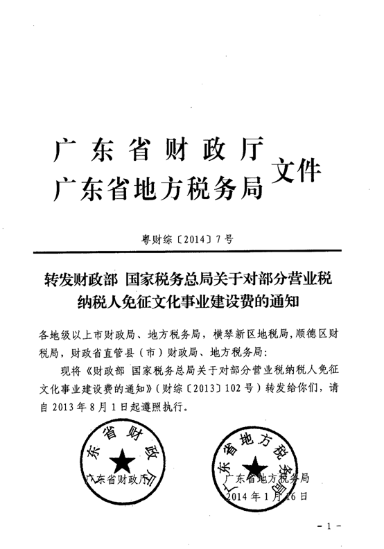 轉發(fā)財政部 國家稅務總局關于對部分營業(yè)稅納稅人免征文化事業(yè)建設費的通知----粵財綜〔2014〕7號