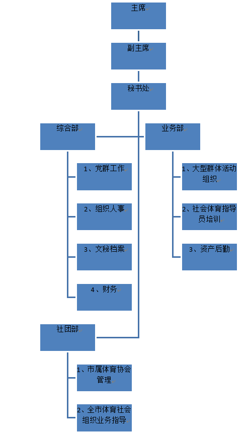 主席——副主席——秘書處——綜合部(1.黨群工作、2.組織人事、3.文秘檔案、4.財(cái)務(wù))、業(yè)務(wù)部(1.大型群體活動(dòng)組織、2.社會(huì)體育指導(dǎo)員培訓(xùn)、3.資產(chǎn)后勤)、社團(tuán)部(1.市屬體育社會(huì)管理、2.全市體育社會(huì)組織業(yè)務(wù)指導(dǎo))