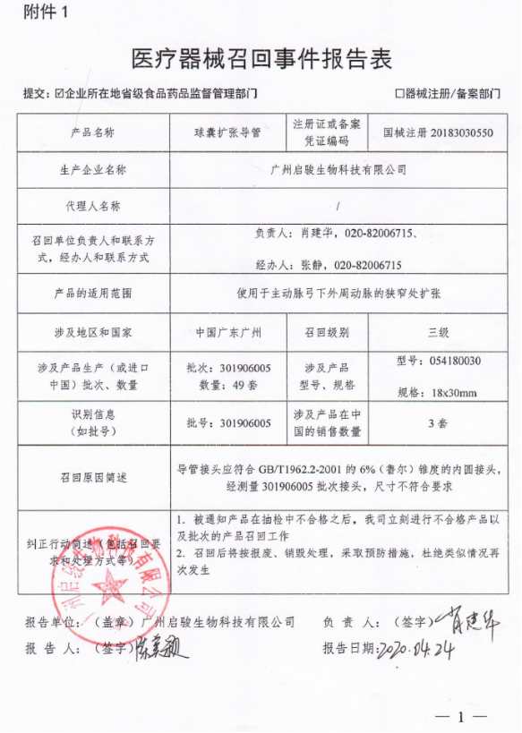 廣州啟駿生物科技有限公司報(bào)告,產(chǎn)品抽檢中發(fā)現(xiàn)部分球囊擴(kuò)張導(dǎo)管存在導(dǎo)管接頭尺寸不符合要求的問題。廣州啟駿生物科技有限公司對其生產(chǎn)的該產(chǎn)品(注冊證號:國械注準(zhǔn)20183030550)主動(dòng)召回。召回級別為 三級 。涉及產(chǎn)品的型號、規(guī)格及批次等詳細(xì)信息見《醫(yī)療器械召回事件報(bào)告表》。