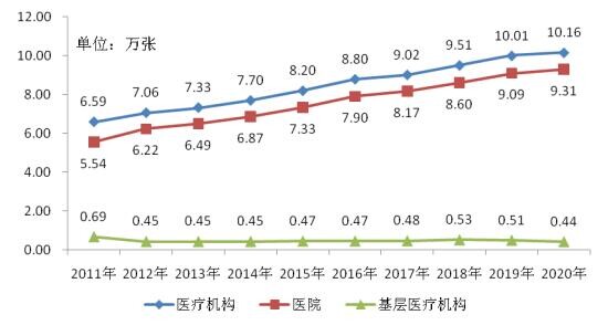 截止2020年底,全市醫療機構擁有床位10.16萬張,其中:醫院9.31萬張(內:民營醫院1.89萬張),衛生院0.19萬張,婦幼保健機構0.38萬張,專科疾病防治機構0.01萬張,社區衛生服務機構0.25萬張。與上年相比,醫療機構床位總量增加0.16萬張,增長1.56%。