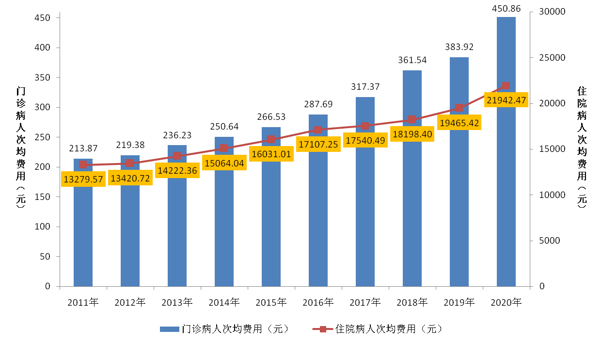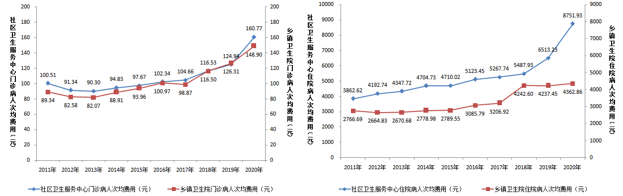 2020年,社區衛生服務中心次均門診、住院費用分別為160.77元、8751.93元,分別較上年增長28.68%、34.37%。鄉鎮衛生院次均門診、住院費用分別為148.90元、4362.86元,與上年相比,鄉鎮衛生院次均門診費用增長17.88%,次均住院費用增長2.96%。