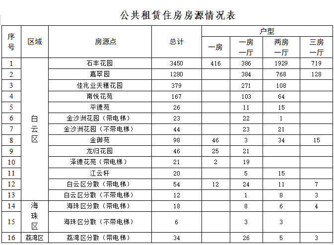 注:各房源租金標準、最新的物管費可查閱《廣州市2021年戶籍家庭公共租賃住房搖號分配指引》。