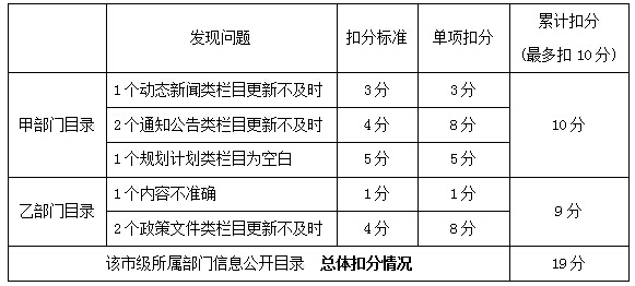 (二)本級地方政府所屬部門信息公開目錄 本級政府所屬部門信息公開目錄需關注空白欄目、更新不及時、內(nèi)容不準確、鏈接可用性問題,按問題發(fā)現(xiàn)個數(shù)累計扣分,每部門最多扣10分,全部所屬部門總體扣分不設上限。 例如:某市政府門戶網(wǎng)站市級所屬部門信息公開目錄中,有2個部門目錄存在問題,具體問題類型、數(shù)量和扣分計算過程如下。該市所屬部門信息公開目錄總體扣19分。