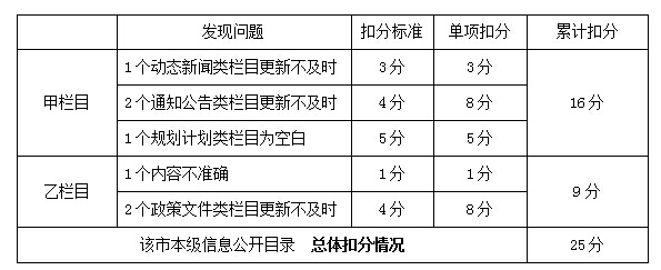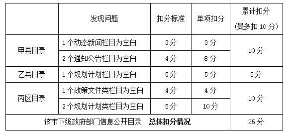 (三)下一級地方政府信息公開目錄 下一級政府信息公開目錄僅需關注空白欄目和鏈接可用性問題,按問題發(fā)現(xiàn)個數(shù)累計扣分,每單位最多扣10分,全部下一級政府總體扣分不設上限。 例如:某市政府門戶網(wǎng)站上各區(qū)縣信息公開目錄中,有3個目錄存在問題,具體問題類型、數(shù)量和扣分計算過程如下。該市下級政府信息公開目錄總體扣25分。