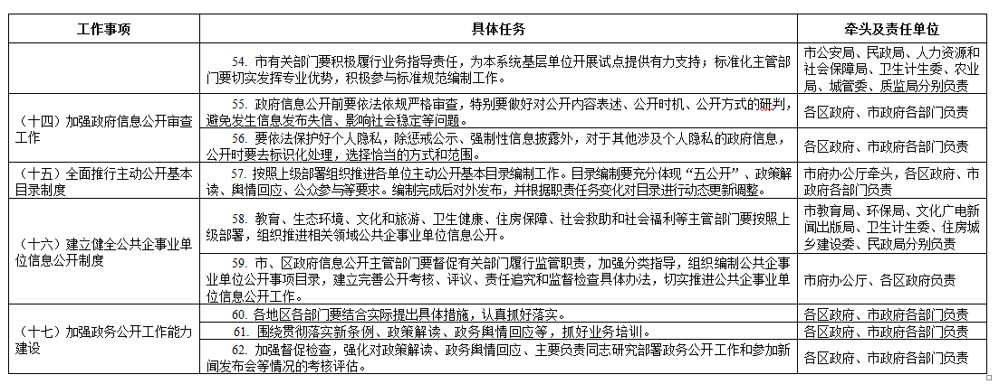 各區(qū)政府、市各單位要根據本方案中的分工,結合實際制定本單位的具體實施方案,提出各具體任務的責任單位(處室)、實施步驟、完成時間節(jié)點、工作要求等,于6月30日前在本單位網站公布,并抓好方案實施。各牽頭單位要積極主動組織協(xié)調相關責任單位抓好牽頭任務的落實。市政務公開辦要適時上網檢查各單位實施方案的按時公布情況,加強對責任單位特別是牽頭單位的督促指導。今年年底,各區(qū)政府、市各單位要將落實情況和證明材料報市政務公開辦匯總報市政府。各單位落實分工方案的情況,作為年度市政務公開工作考核的重要內容,考核結果納入法治廣州建設檢查考核和機關績效考核。