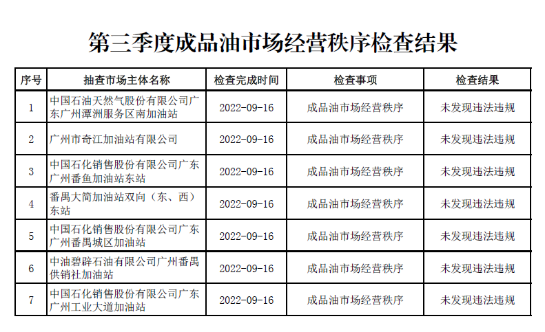 廣州市工業和信息化局關于2022年第三季度成品油市場經營秩序檢查結果的公示
